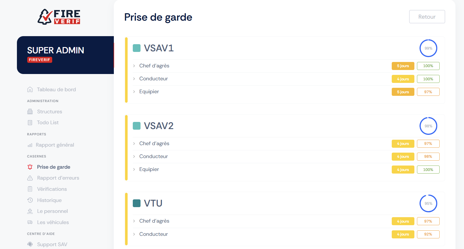 Module d'analyse permettant aux responsables d'examiner les tendances d'utilisation du matériel et l'état des véhicules. Les données centralisées facilitent l'identification des équipements fréquemment défectueux ou manquants, permettant une meilleure planification des achats et des maintenances.