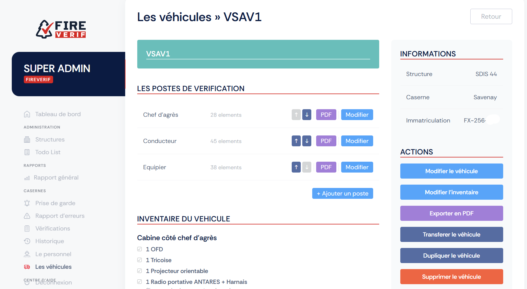 Fonctionnalité permettant de dupliquer ou transférer temporairement des véhicules d'une caserne à l'autre, facilitant ainsi la gestion des renforts. Cette option assure la continuité des inventaires même lors des déplacements d'équipements, garantissant que chaque caserne dispose toujours d'informations à jour.