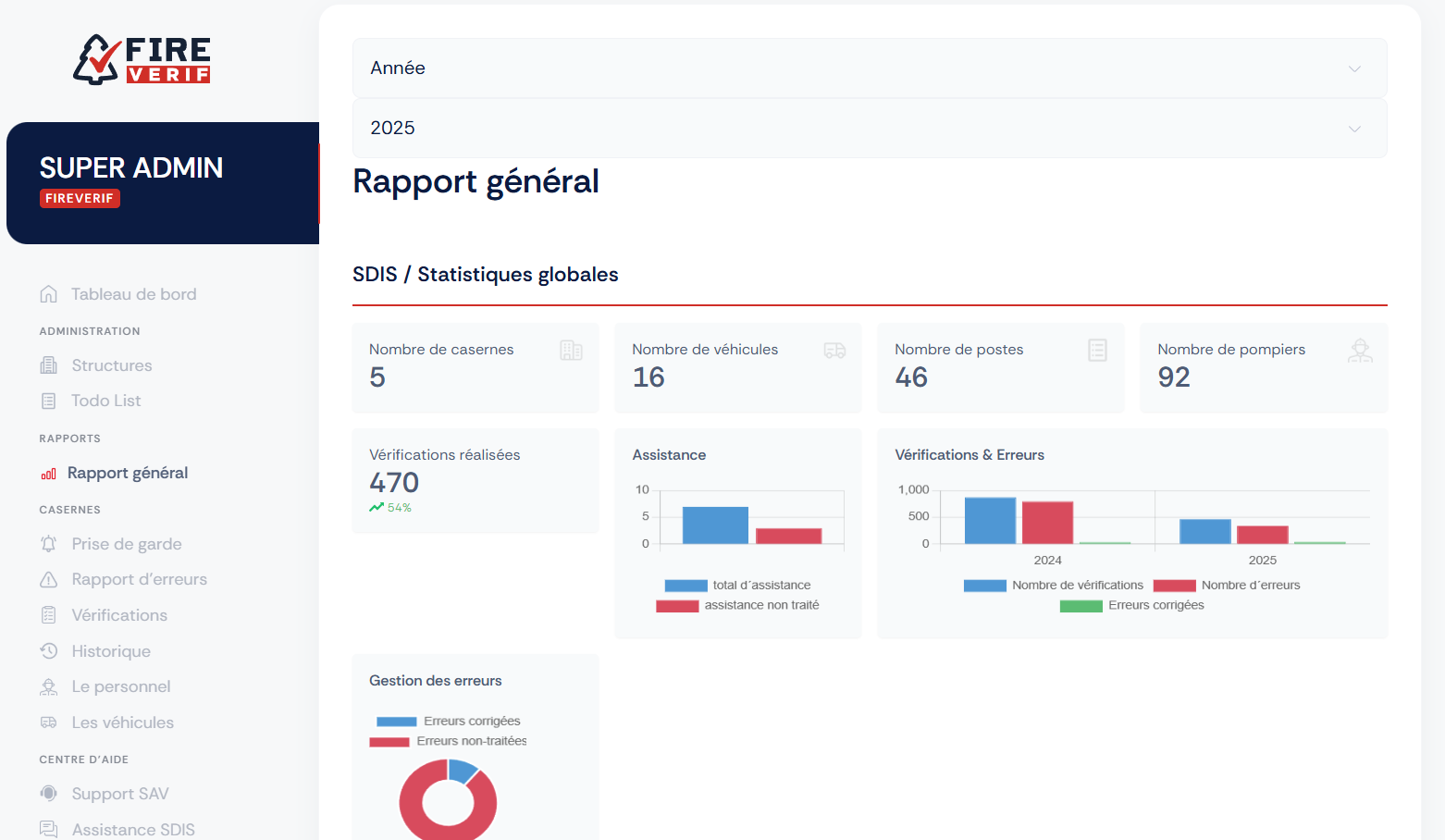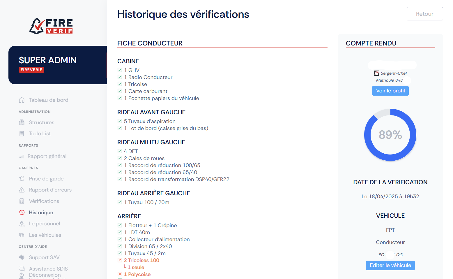 Module d'analyse permettant aux responsables d'examiner les tendances d'utilisation du matériel et l'état des véhicules. Les données centralisées facilitent l'identification des équipements fréquemment défectueux ou manquants, permettant une meilleure planification des achats et des maintenances.